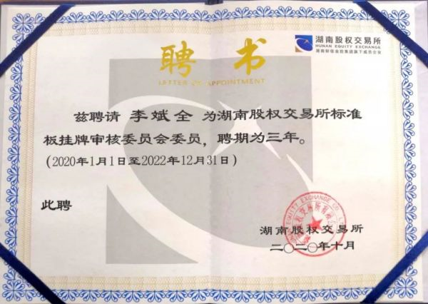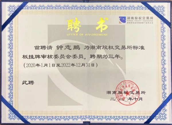 钟志鹏律师、李斌全律师此次获聘为湖南股权交易所标准板挂牌审核委员会委员,既是湖南股权交所对我所律师专业水平的高度认可,也是湘军麓和所坚持助力湖湘企业对接多层次资本市场的责任担当。