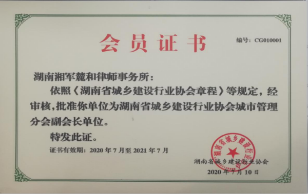 2020年7月10日上午,湖南省城乡建设行业协会城市管理分会成立大会暨第一届会员代表大会在湖南长沙顺利召开。湖南湘军麓和律师事务所当选为副会长单位,我所立法与行政法专业委员会主任范涛律师当选为第一届理事会理事。