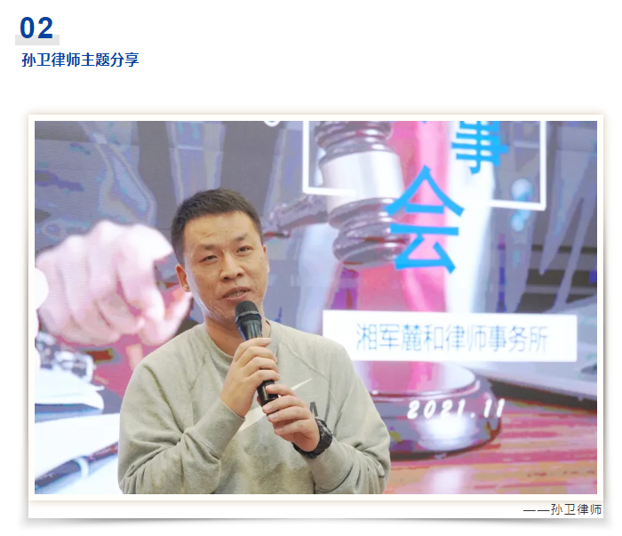 第二位分享嘉宾为公司法律事务专业委员会负责人孙卫律师,他以“专注+合作=青年律师实现小康不是梦”主题分享了他的从执业经历。孙卫律师表达了他毕业以来一直从事公司法律事务,执业之初在团队的影响下,积极在《长沙律师》、《湖南律师》、《中国律师》等期刊发表公司法律相关专业文章,并通过团队大量的公司法律事务锤炼,让自己的专业知识积累不断的突飞猛进。