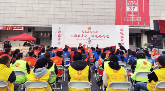工会在身边,温暖你我他。11月23日上午,芙蓉区总工会在友谊阿波罗商业广场举办了“工会进万家·新就业形态劳动者温暖行动”服务月启动仪式,正式拉开温暖行动序幕。长沙市总工会权益保障部部长张孟,芙蓉区总工会党组书记、主席胡锋,五里牌街道党工委书记王宏武等领导出席本次活动。