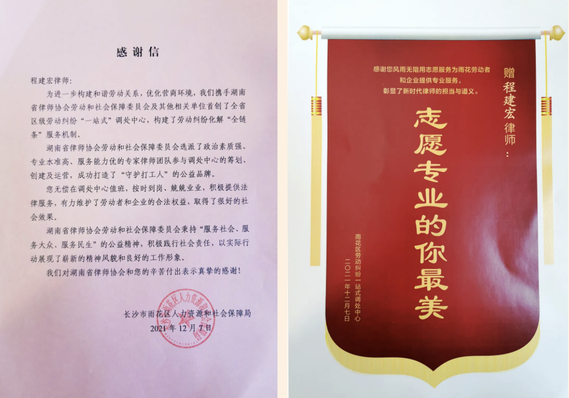 近日,长沙市雨花区人社局为我所程建宏律师发送了感谢信,与此同时,湖南全省首个区级劳动争议“一站式”调处中心——雨花区劳动争议“一站式”调处中心为其颁发了“志愿专业的你最美”荣誉锦旗。