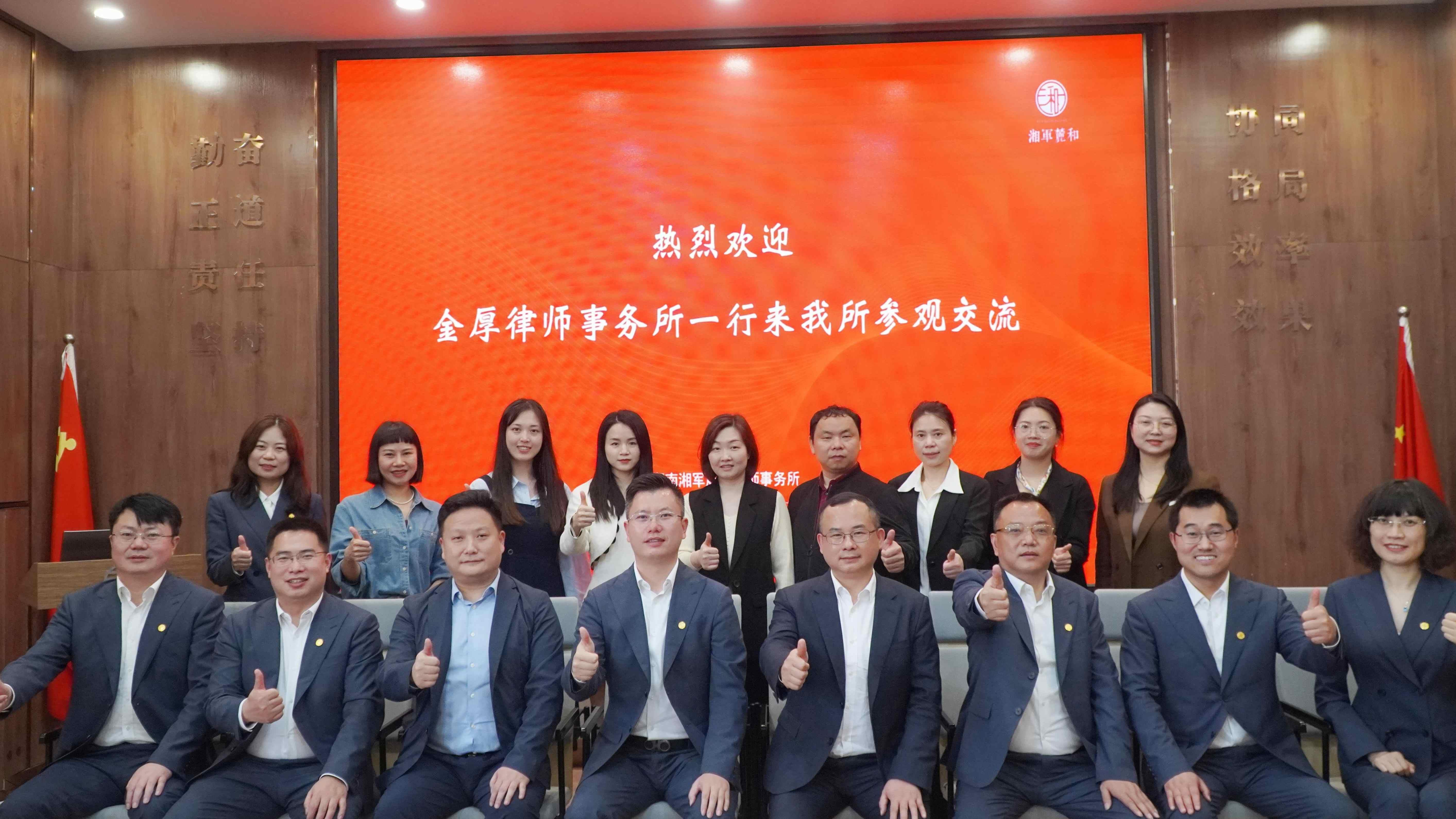 4月3日下午,湖南金厚律师事务所主任刘兴华,董事会主席肖超元,管委会主任何奎,管委会副主任雍彬,高级合伙人、副主任刘国梁,高级合伙人、团支部书记杨意丰,管委会执行主任隋兴等一行到访湘军麓和所参观交流。