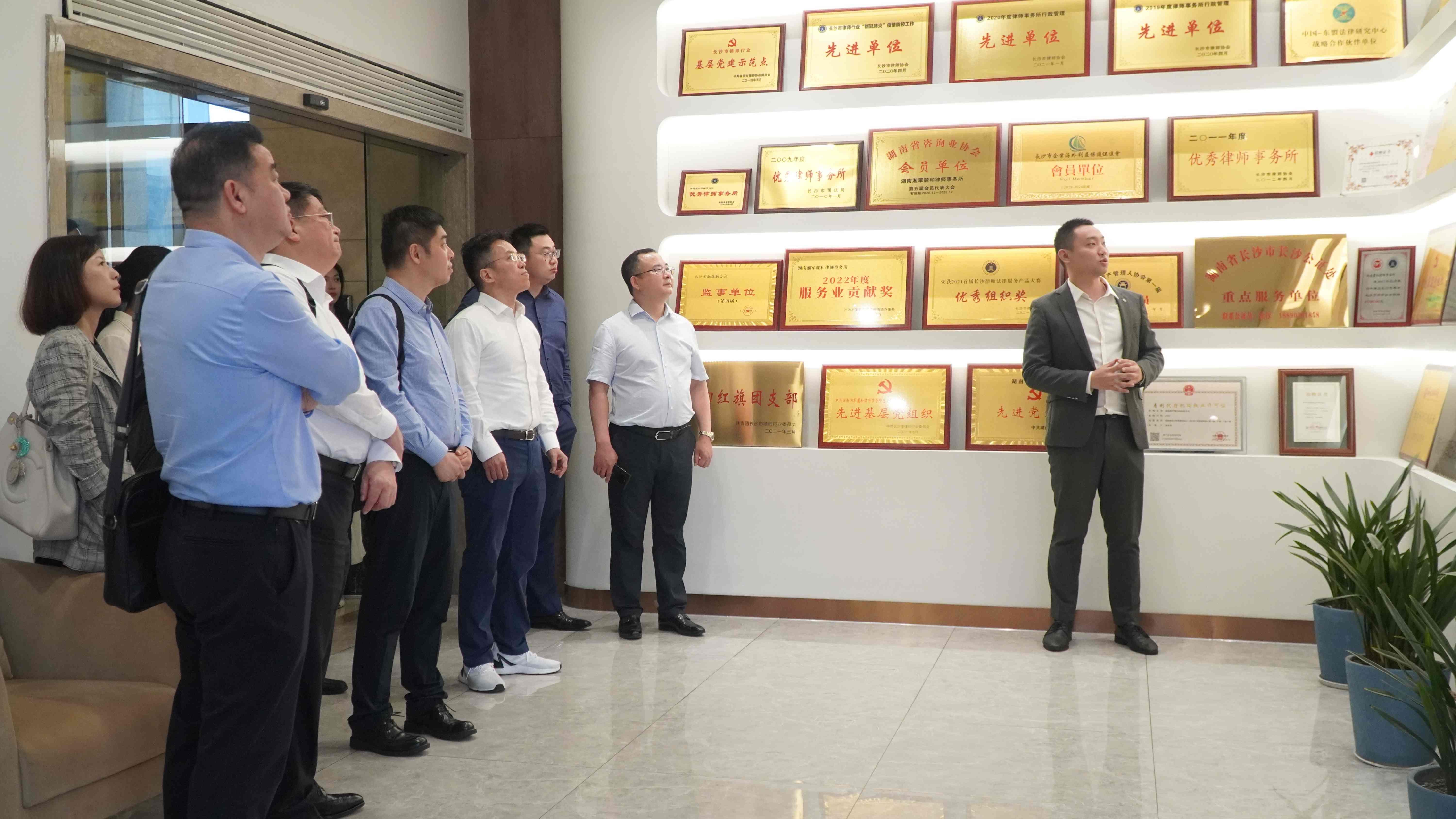6月5月下午,上海市律师协会副会长陈峰,上海律协理事、青年律师工作委员会主任陆胤,上海律协理事、青年律师工作委员会副主任周郁生,律所规范与发展委员会副主任冯加庆等一行到访湖南湘军麓和律师事务所考察交流,湘军麓和所党总支书记、主任李含英,执行主任钟志鹏等全程陪同参观并参加座谈。