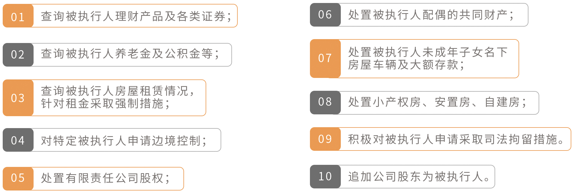民事执行进阶法律服务的关键在于“进阶”0常规的执行措施包括冻结银行存款、查封房产以及车辆等等,而本法律服务产品的“进阶”体现在提供常规执行措施以外的执行措施。本产品提供的法律服务内容包括且不限于: