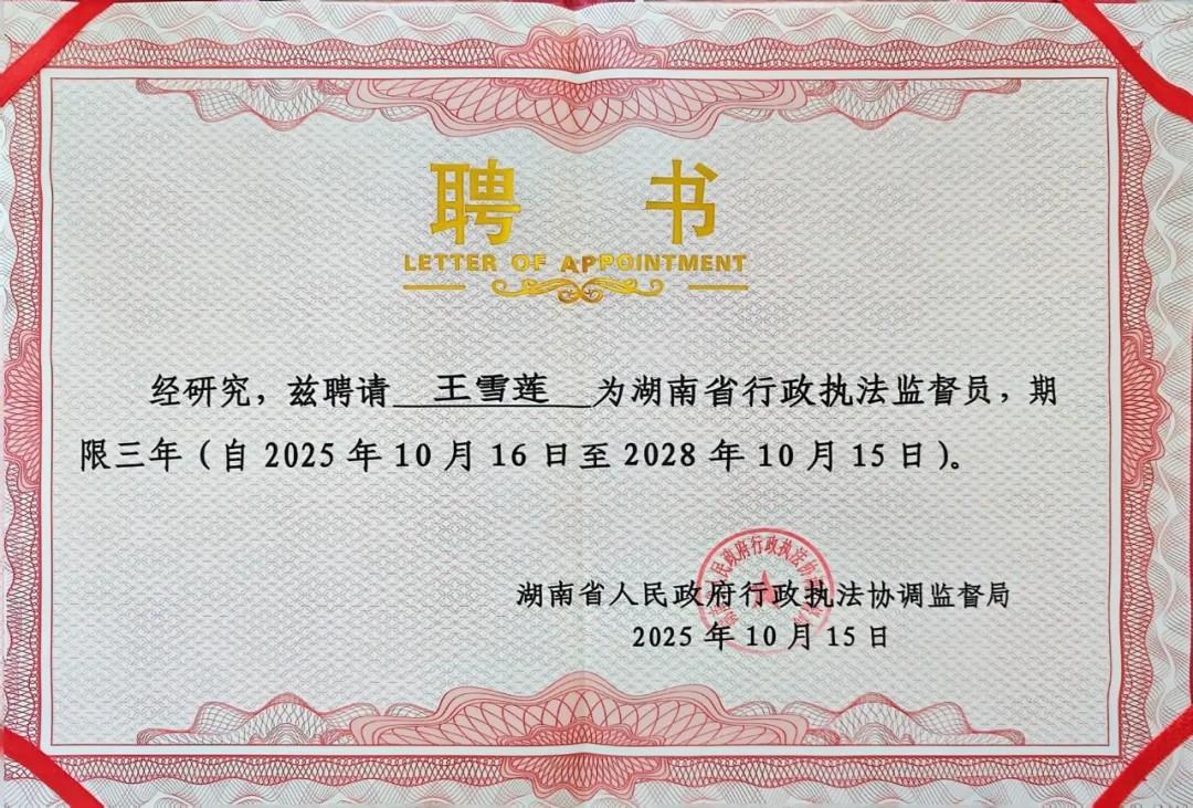 我所高级合伙人王雪莲律师获九三学社中央表彰为九三学社全国优秀社员。与此同时,经湖南省人民政府行政执法协调监督局公示选任,王雪莲律师亦受聘为湖南省行政执法监督员,双重荣誉彰显其专业能力与社会责任担当。