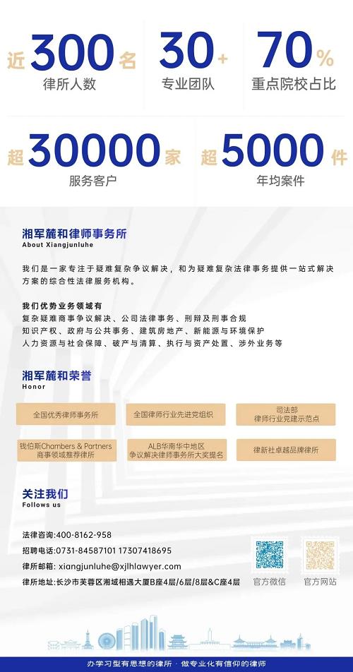 展望未来,我们将持续秉承“经世致用、包容并蓄、敢为人先、和而不同”的湖湘文化与湘军精神,坚守“客户至上、诚信执业、勤勉服务、以法助人”的办所宗旨,不断精进专业能力,为客户提供更高品质、更具效率的法律服务。