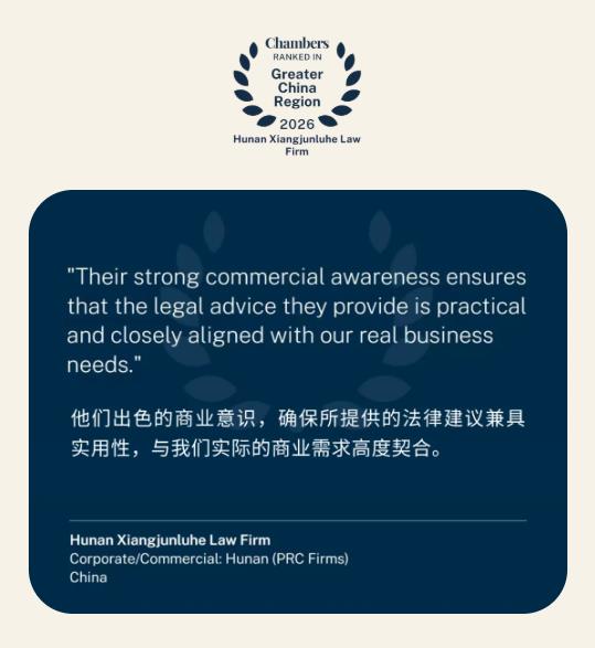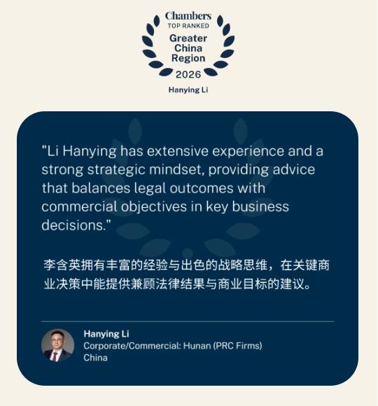 1月15日,国际知名法律评级机构钱伯斯(Chambers and Partners)发布《2026大中华区法律指南》( Greater China Region Legal Guide 2026)。湘军麓和律师事务所被评为公司商事·湖南 BAND2律师事务所,湘军麓和首席合伙人李含英荣获公司商事·湖南 BAND1律师。