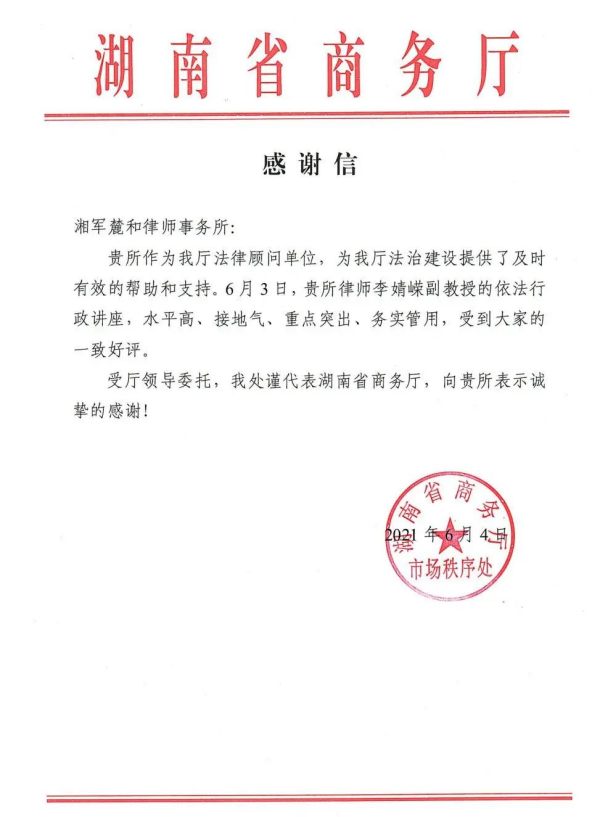 为感谢我所本次讲座对湖南省商务厅法治建设的帮助,湖南省商务厅市场秩序处特写感谢信,对我所表示诚挚的谢意。