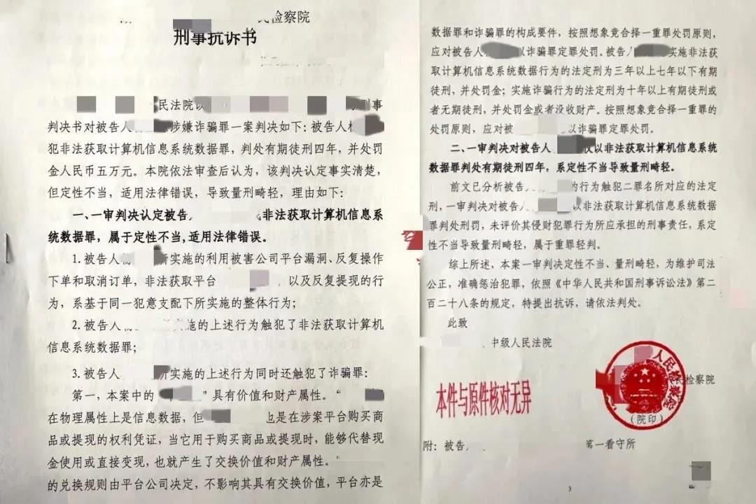 本以为这次刑事风波在此刻终于赢来了转机,然而未想到的是,一审判决后,公诉机关于2024年1月向某中院提出抗诉,公诉机关认为:一审适用法律错误,导致量刑畸轻。Y某利用某公司平台漏洞,反复操作下单和取消订单,非法获取“某豆值”后反复提现的行为,系基于同一犯意支配下所实施的整体行为,同时触犯了非法获取计算机信息系统数据罪和诈骗罪两个罪名,应按照想象竞合择一重罪处罚原则,对Y某以诈骗罪定罪处罚。