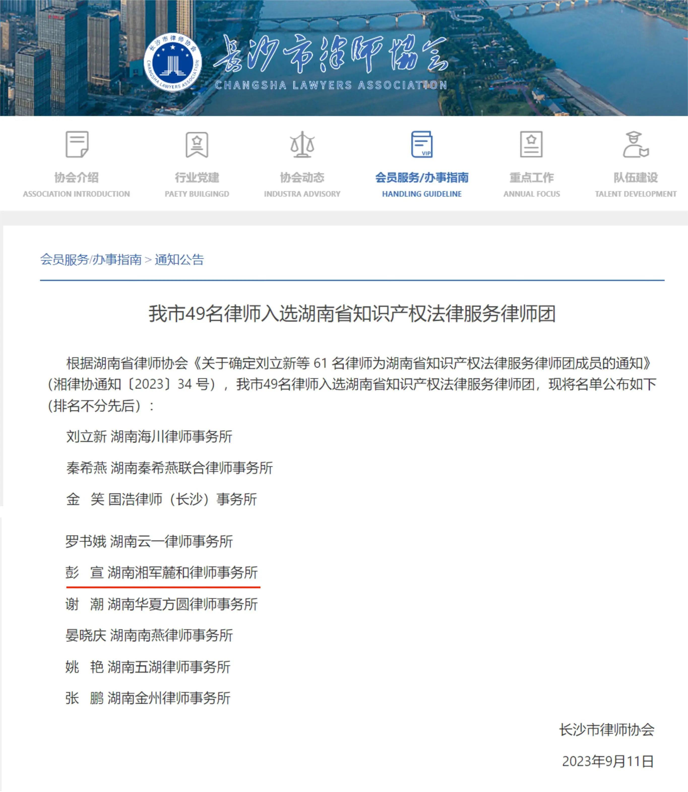为积极推进律师行业人才建设,大力培育知识产权法律人才,组建一支政治强、素质高、专业精的专家团队,湖南省律师协会近期面向全省一万多名律师遴选省知识产权法律服务律师团成员。我所知识产权委员会副主任彭宣律师凭借多年卓越的专业表现与杰出的客户口碑,入选湖南省知识产权法律服务律师团。