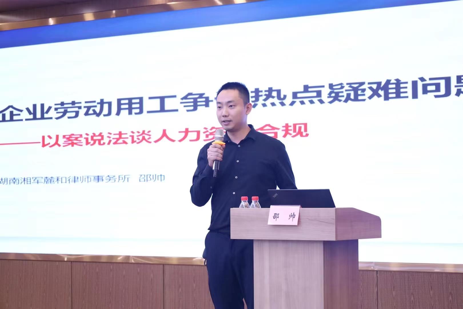 2023年9月14日,长沙市人社局“和谐三湘行”劳动关系协调能力提升训练营第八场在湘江科创基地开讲。湖南湘军麓和律师事务所党委第一支部书记、管委会副主任、教育培训与青年工作委员会主任邵帅律师受邀为受邀为长沙市人社局开展《企业劳动用工争议热点疑难问题》专题讲座。