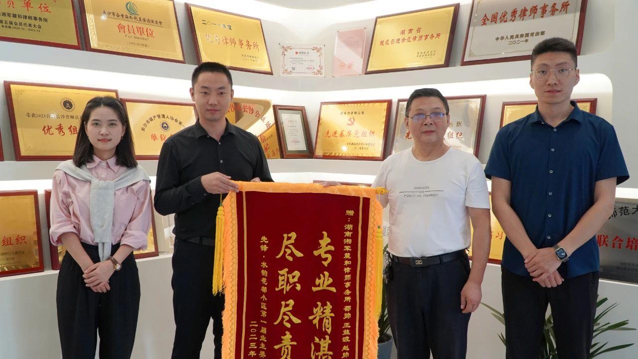 近日,先锋·水韵花都业委会代表来到湘军麓和律师事务所,将写着“专业精湛 尽职尽责”的锦旗送到邵帅、赵帅龙、王益波三位律师手中,感谢律师在短时间内解决了困扰业主多年的难题。锦旗虽轻,意义却重大,既饱含着水韵花都1200余户业主的信任与谢意,也表达了对三位律师专业水平的充分肯定。