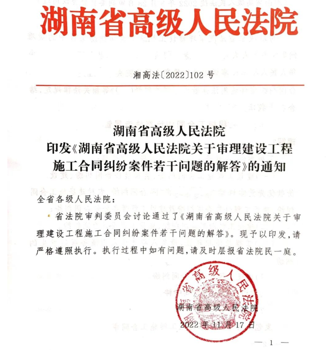 ◎《湖南省高级人民法院关于审理建设工程施工合同纠纷案件若干问题的解答》(湘高法[2022]102号,简称“102号文”)的规定