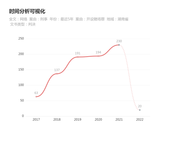 在检索系统以“开设赌场罪”、“网络”为关键词,检索了湖南地区近5年的刑事判决,此类案件总计有835起,且此类案件数量一直处于上升态势。